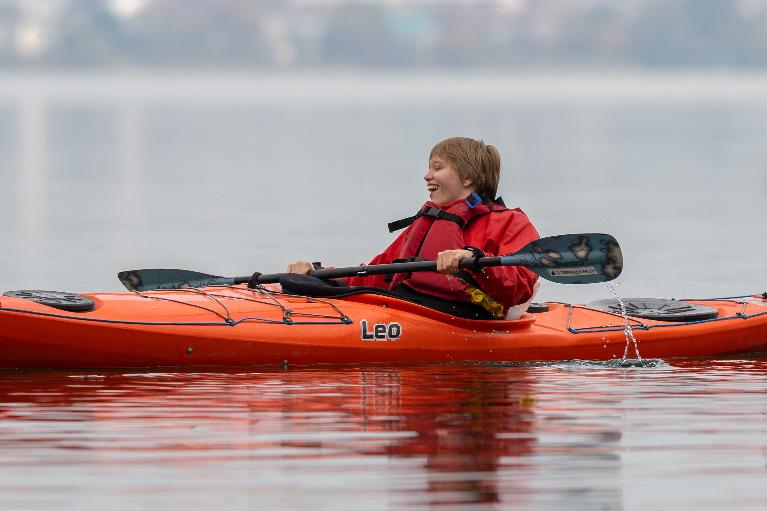 Ein Kajak ist ein kleines, wendiges Paddelboot, dass du mit einem Doppelpaddel übers Wasser bewegst. Friedlich gleitest du über den See.