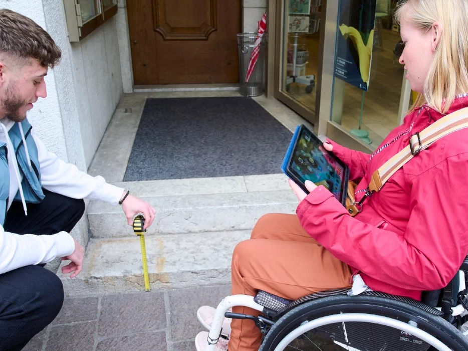 Am «Tag der guten Tat» erfassen freiwillige Helfer*innen gemeinsam mit Betroffenen in mehreren Städten die digitalen Zugänglichkeitsdaten öffentlicher Gebäude und unterstützen beim Ausmessen der Objekte und Erfassen in der Web-basierten Applikation.