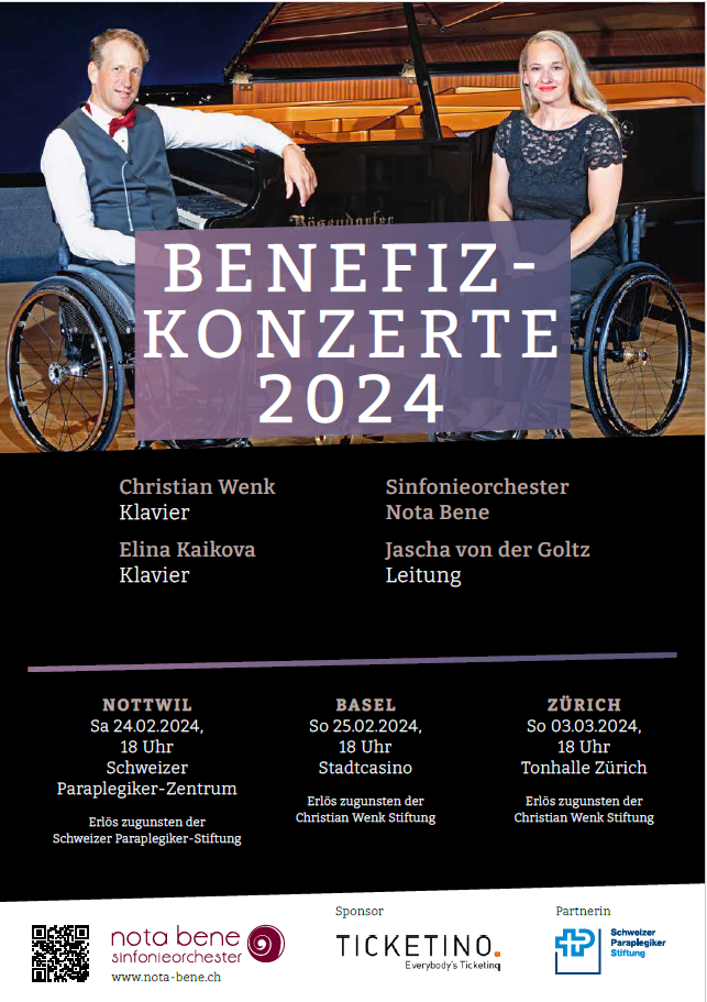 Avec l'orchestre symphonique Nota Bene, ils interprètent un concerto de Max Bruch, compositeur allemand tombé dans l'oubli. Ce projet de concert exceptionnel est né à la suite d'une demande un peu particulière de la pianiste Elina Kaikova. Privée de l'usage de ses jambes, elle souhaitait disposer d'une commande buccale pour les pédales de son piano à queue et Christian Wenk lui a promis de faire construire un tel système pour elle. En collaboration avec la Fondation suisse pour paraplégiques, la commande buccale pour pianiste a vu le jour, et elle est désormais à la disposition de toutes les personnes intéressées. Une idée en a entraîné une autre: ensemble, ils voulaient interpréter le «Concerto pour deux pianos et orchestre» de Max Bruch, à la fois beau et largement inconnu, et ont fait part de leur souhait à l'orchestre symphonique Nota Bene d'organiser trois concerts de bienfaisance.