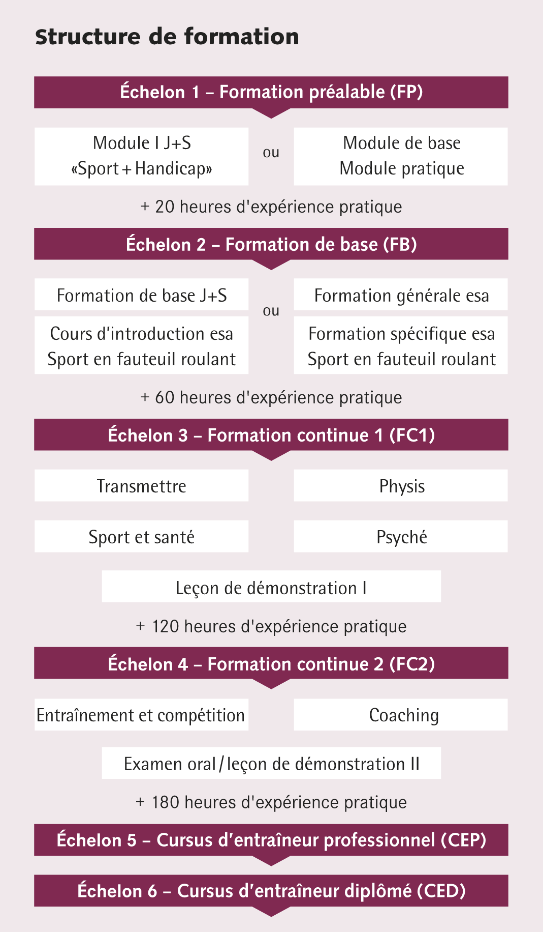 Tu suis les matières «Entraînement et compétition» et «Coaching». En outre, tu effectues un stage dans un club en fauteuil roulant. Tu valides cet échelon par une leçon de démonstration et une épreuve orale.